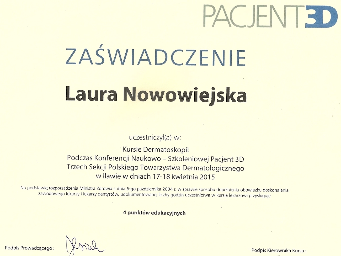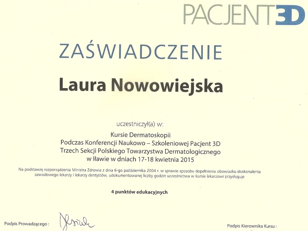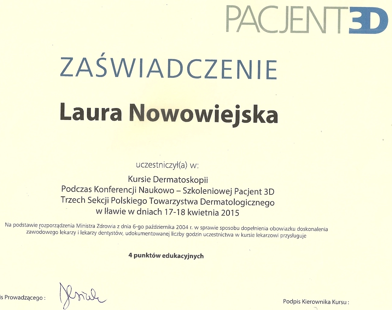 Jestem członkiem Polskiego Towarzystwa Dermatologii i Wenerologii oraz Sekcji Dermatologii Estetycznej Polskiego Towarzystwa Lekarskiego. Swoją wiedzę stale poszerzam poprzez uczestnictwo w licznych konferencjach i szkoleniach w Polsce i za granicą.