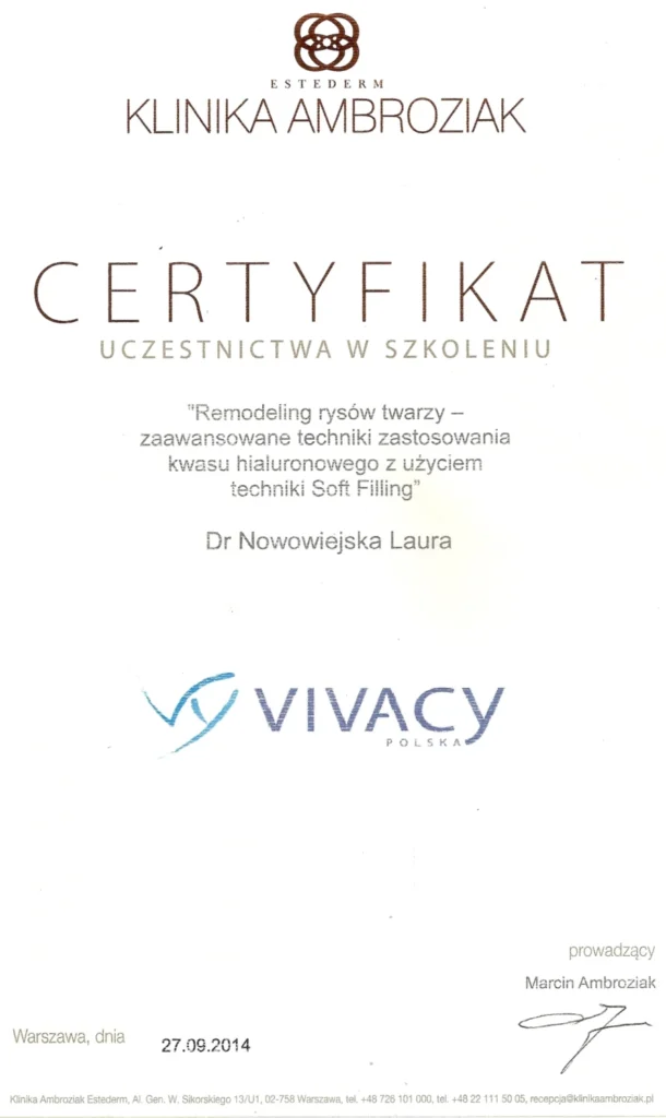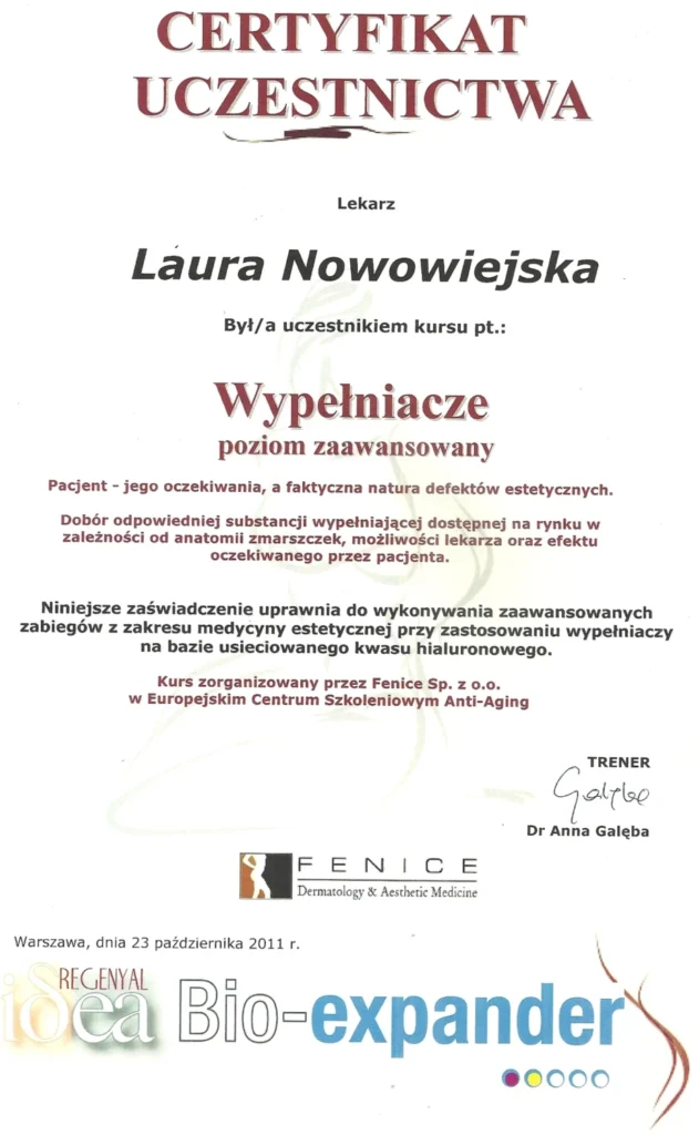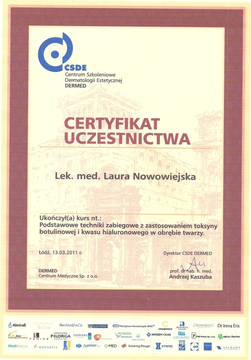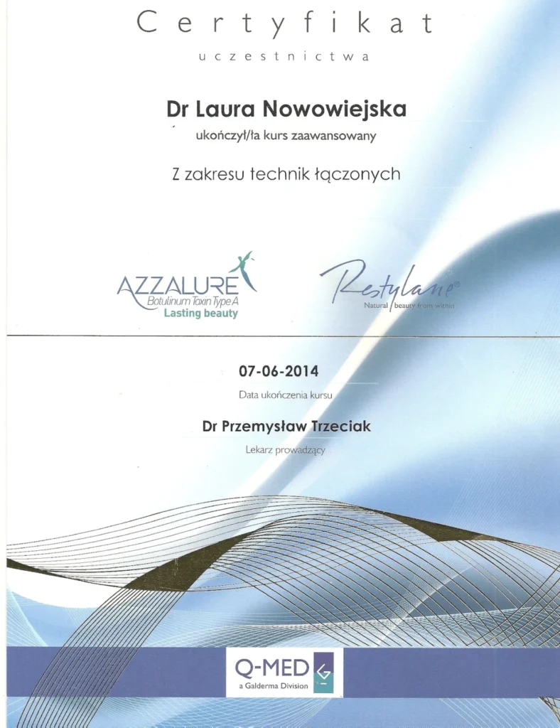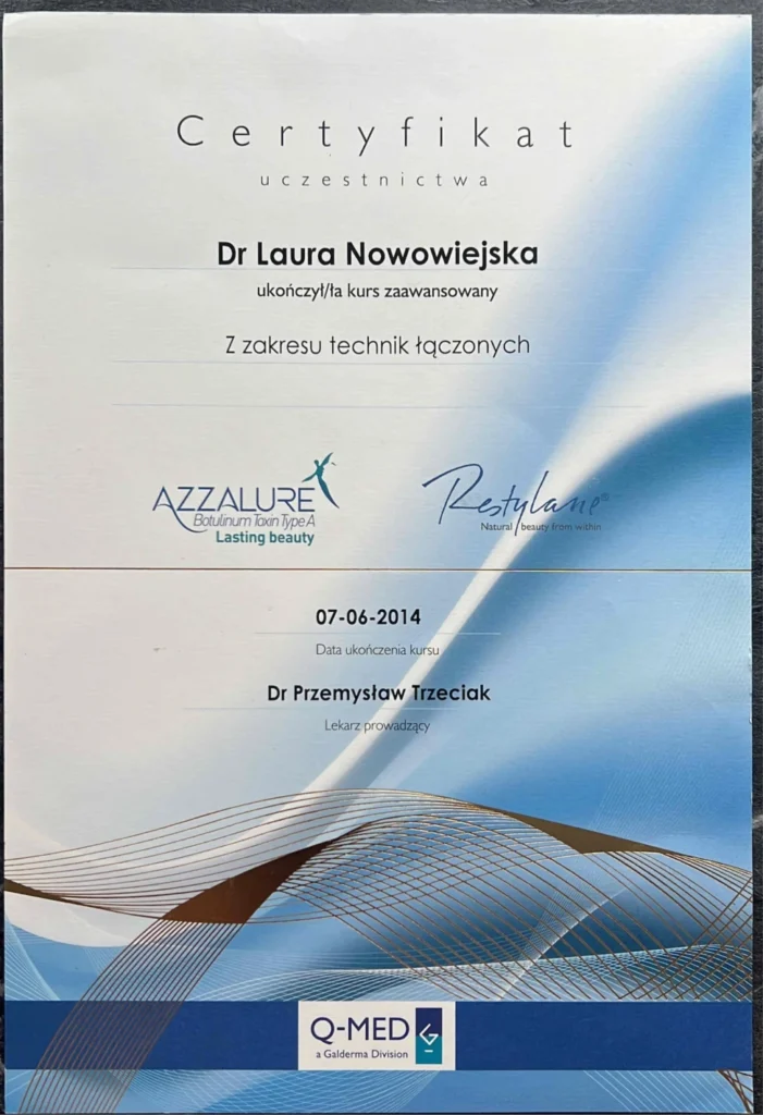 W kręgu moich szczególnych zainteresowań znajdują się zabiegi z zakresu medycyny estetycznej. Wiedza dermatologiczna oraz stałe doskonalenie w metodach przywracania skórze piękna umożliwiają mi holistyczne podejście do problemów pacjenta. Wykonuję zabiegi modelowania twarzy przy zastosowaniu preparatów kwasu hialuronowego, kwasu polimlekowego, hydroksyapatytu wapnia, toksyny botulinowej oraz nici PDO. Stale doskonalę swoje umiejętności w zakresie nowych technik laserowych w usuwaniu rozszerzonych naczyń, rumienia, blizn, rozstępów i przebarwień skóry.