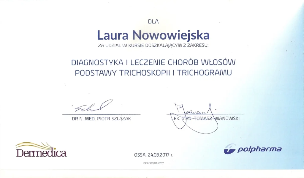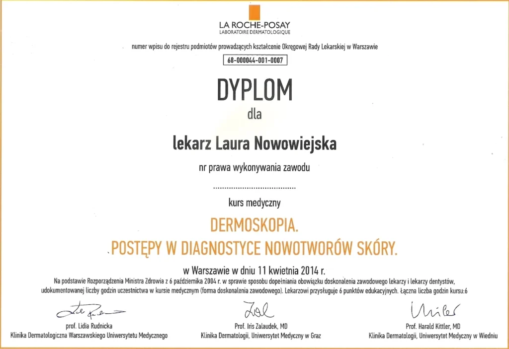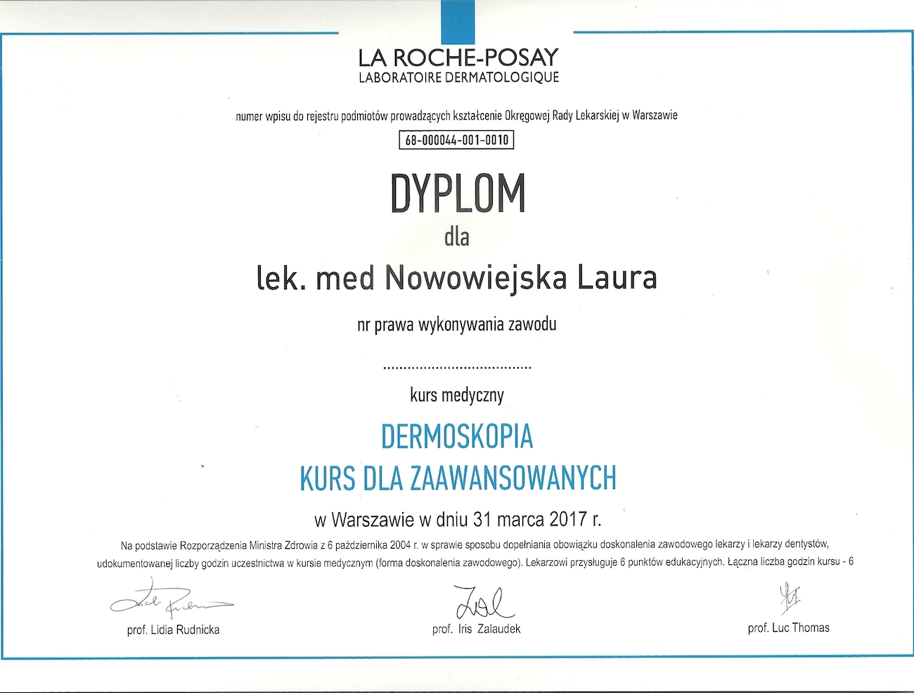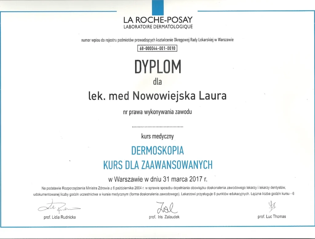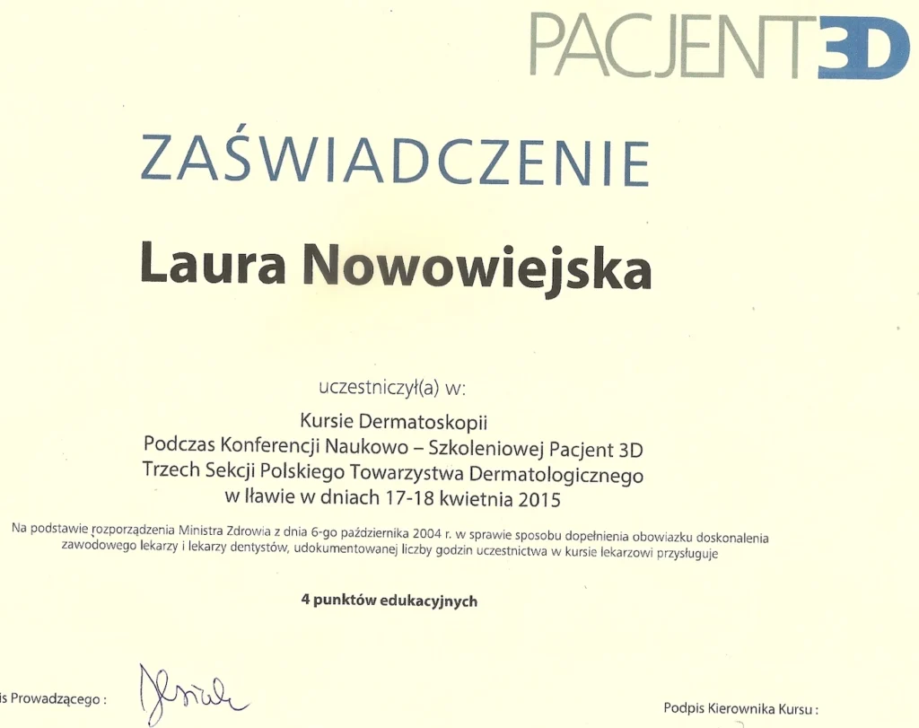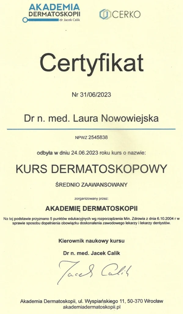 Jestem absolwentem Collegium Medicum Uniwersytetu im. Mikołaja Kopernika w Bydgoszczy. Staż specjalizacyjny z zakresu dermatologii i wenerologii odbyłam w Klinice Dermatologii, Chorób Przenoszonych Drogą Płciową i Immunodermatologii Szpitala Uniwersyteckiego nr 1 im. A. Jurasza w Bydgoszczy.