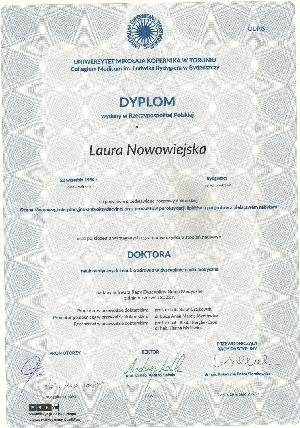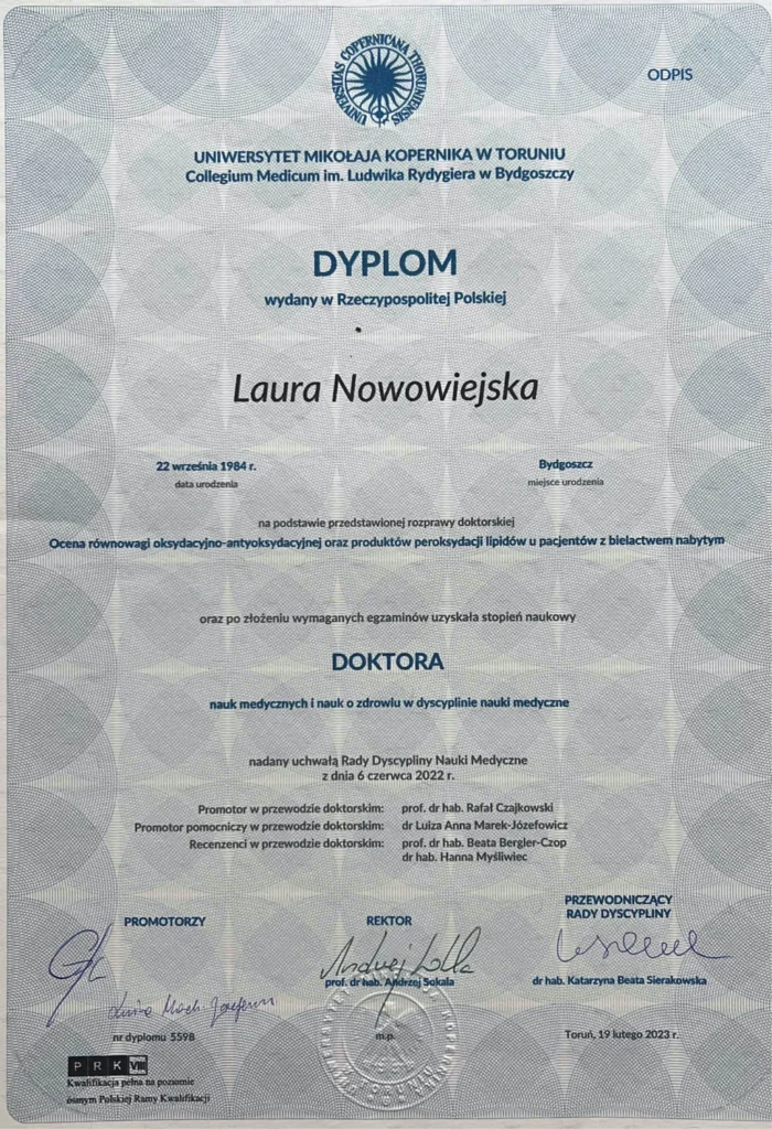 W 2022 r uzyskałam tytuł doktora nauk medycznych i nauk o zdrowiu na podstawie obrony rozprawy doktorskiej pt. ,, Ocena równowagi oksydacyjno-antyoksydacyjnej oraz produktów peroksydacji lipidów u pacjentów z bielactwem nabytym „. Przez wiele lat byłam asystentem na Wydziale Lekarskim Colegium Medicum w Bydgoszczy. Obecnie jestem zatrudniona w CM stanowisku adiunkta i prowadzę zajęcia ze studentami na Wydziale Farmaceutycznym.